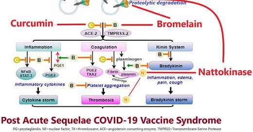 The use of proteolytic (protein chewing!) enzymes (nattokinase and bromelain) and immune modulating curcumin allows for graded and effective removal of the Spike-Proteins. The publication highlights that effective use of these supplements to stop and help remove the S-protein, allowing the opportunity for the body to heal.